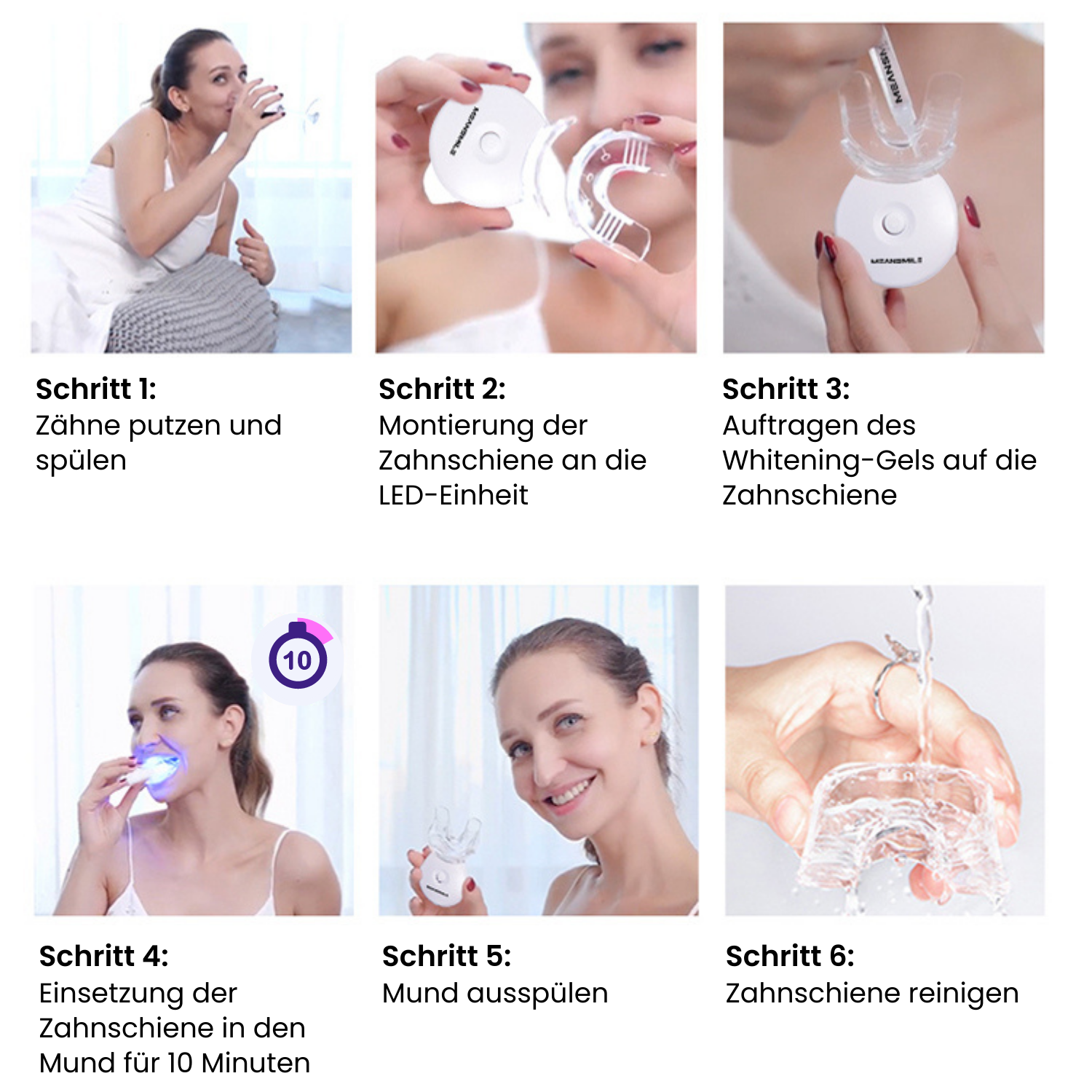 Erfülle dir den Wunsch nach einem helleren Lächeln – mit unserem cleveren meansmile PAP+ LED-Zahnaufhellungsset, das dir eine schnelle und wirkungsvolle Möglichkeit bietet, dein Ziel zu erreichen.