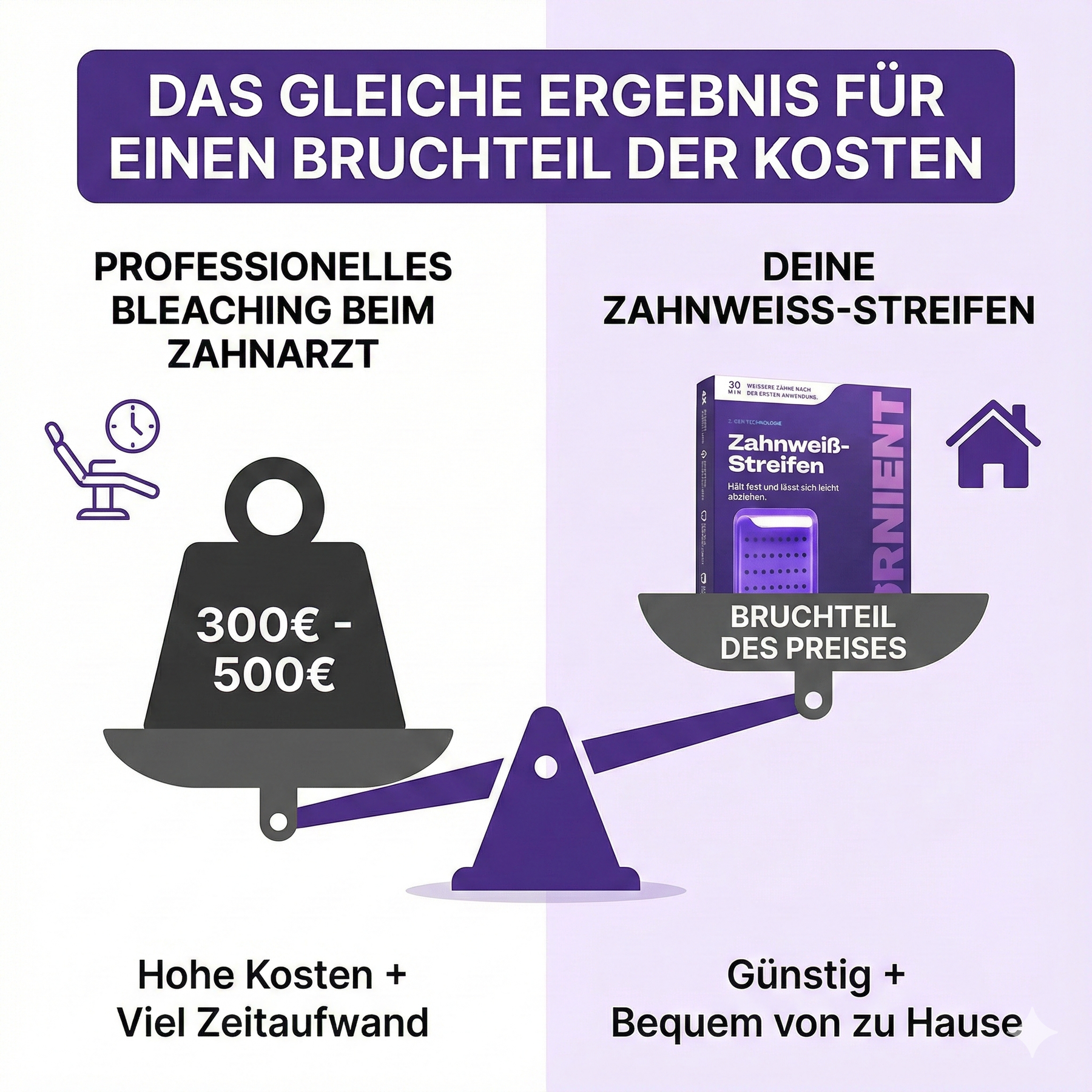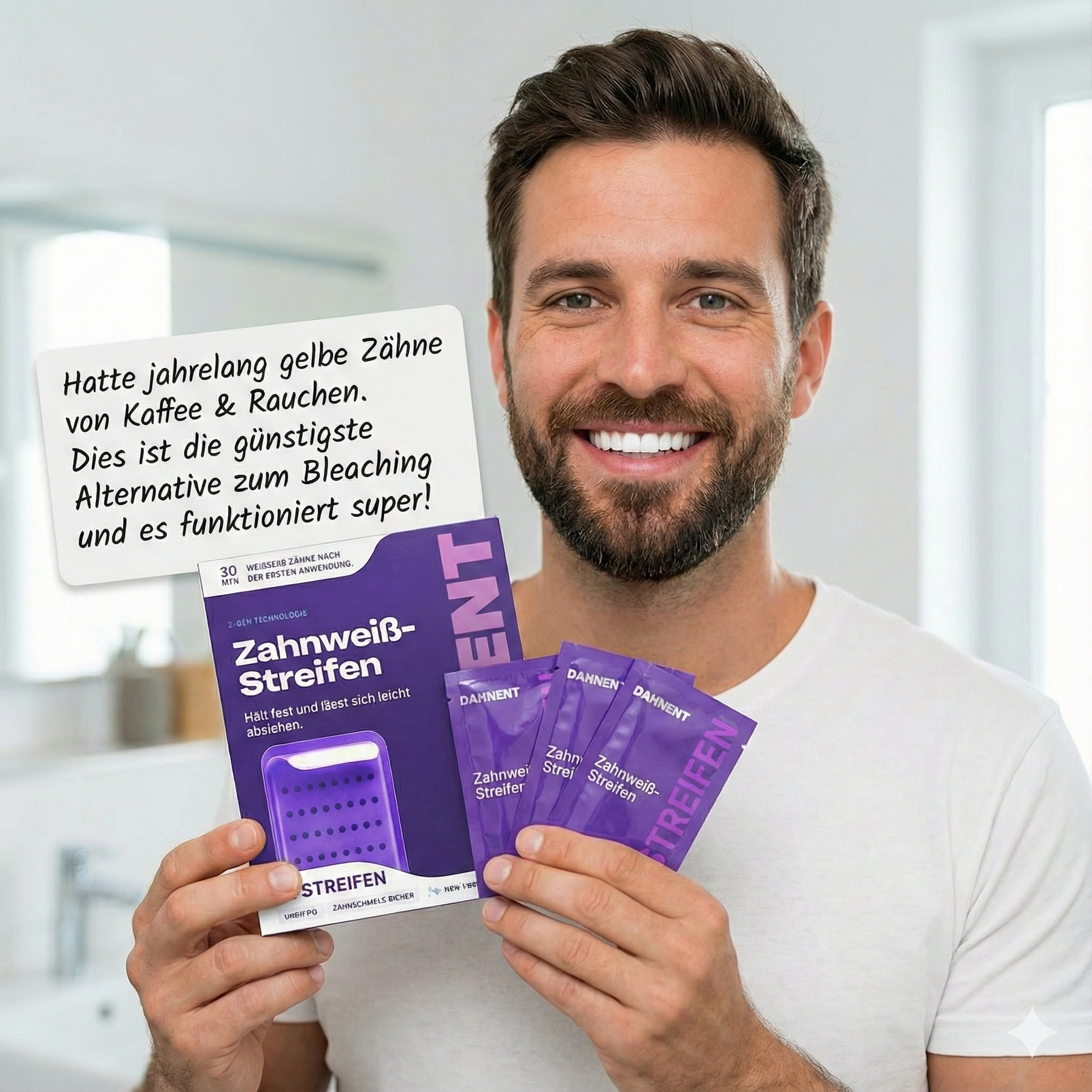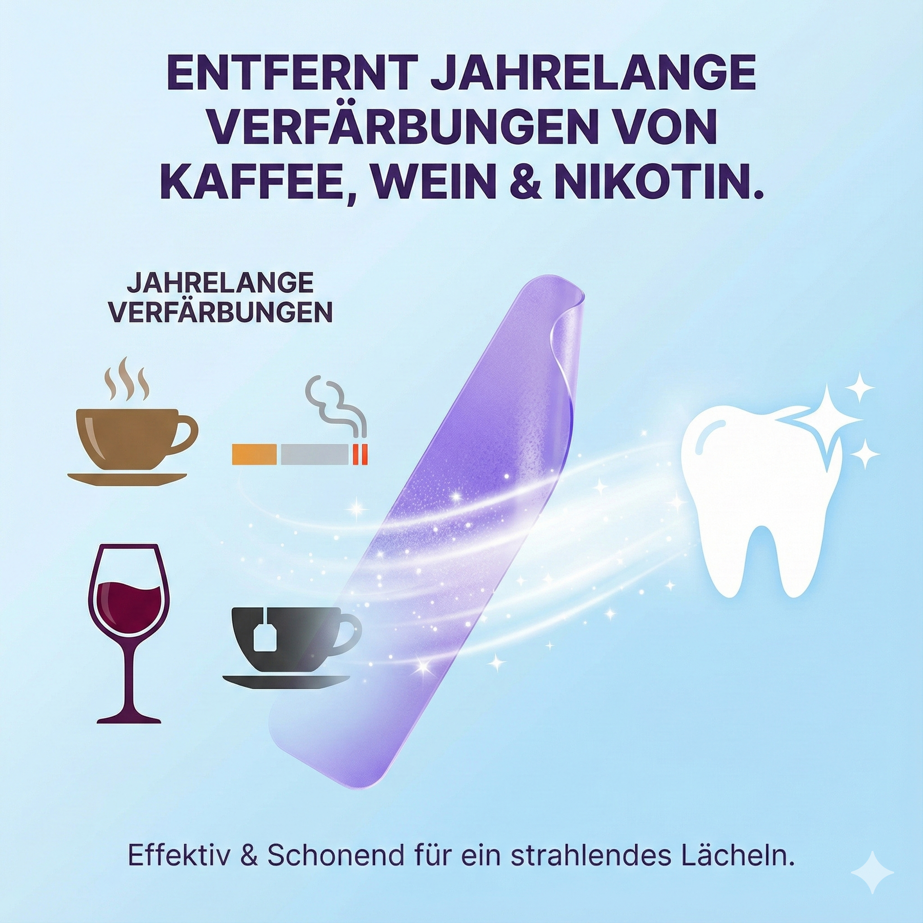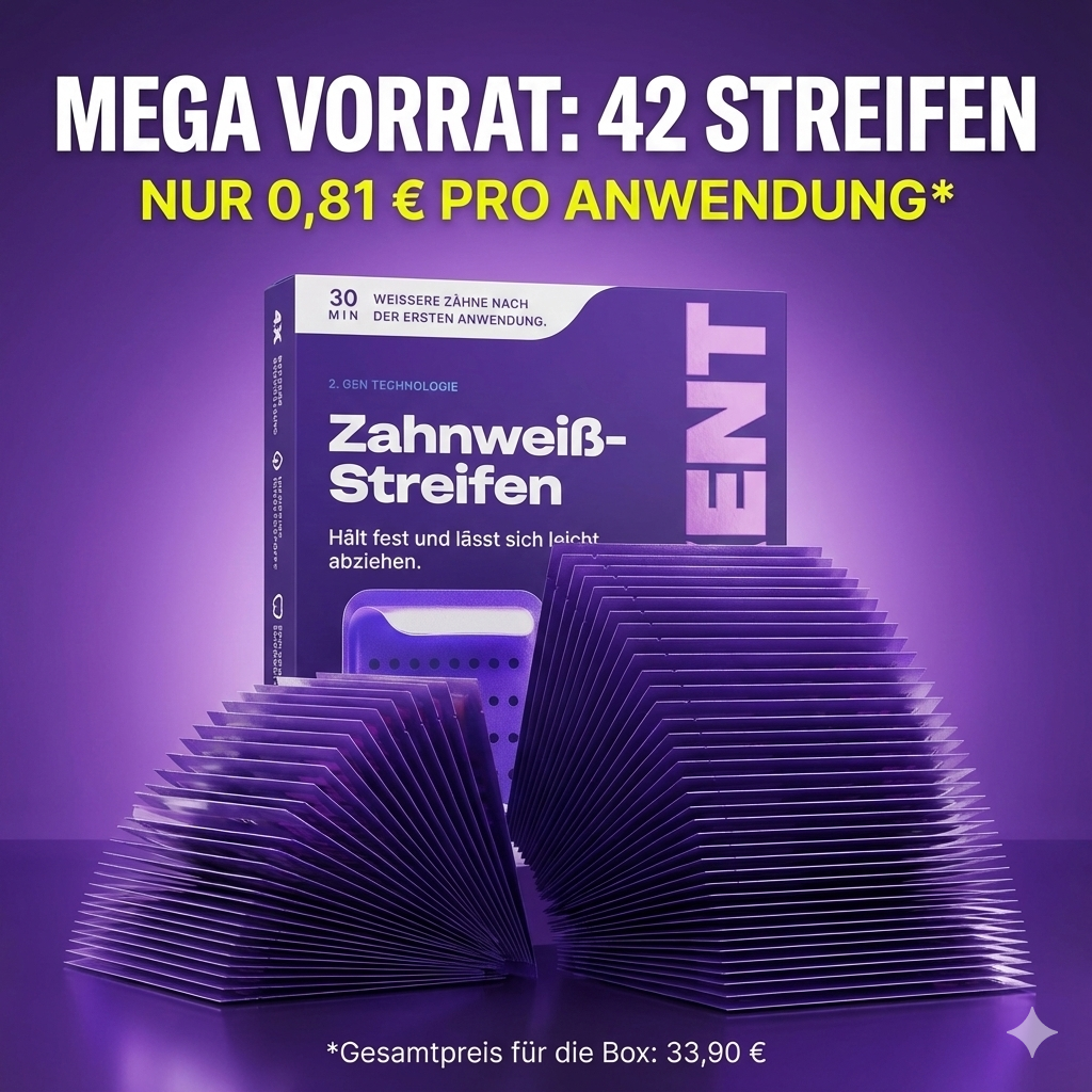 Unsere Strips nutzen die innovative PAPP-Formel. Sie oxidiert Verfärbungen (Kaffee, Wein, Rauchen), ohne den Zahnschmelz anzugreifen. Sicher, schnell und zu einem Bruchteil der Kosten.