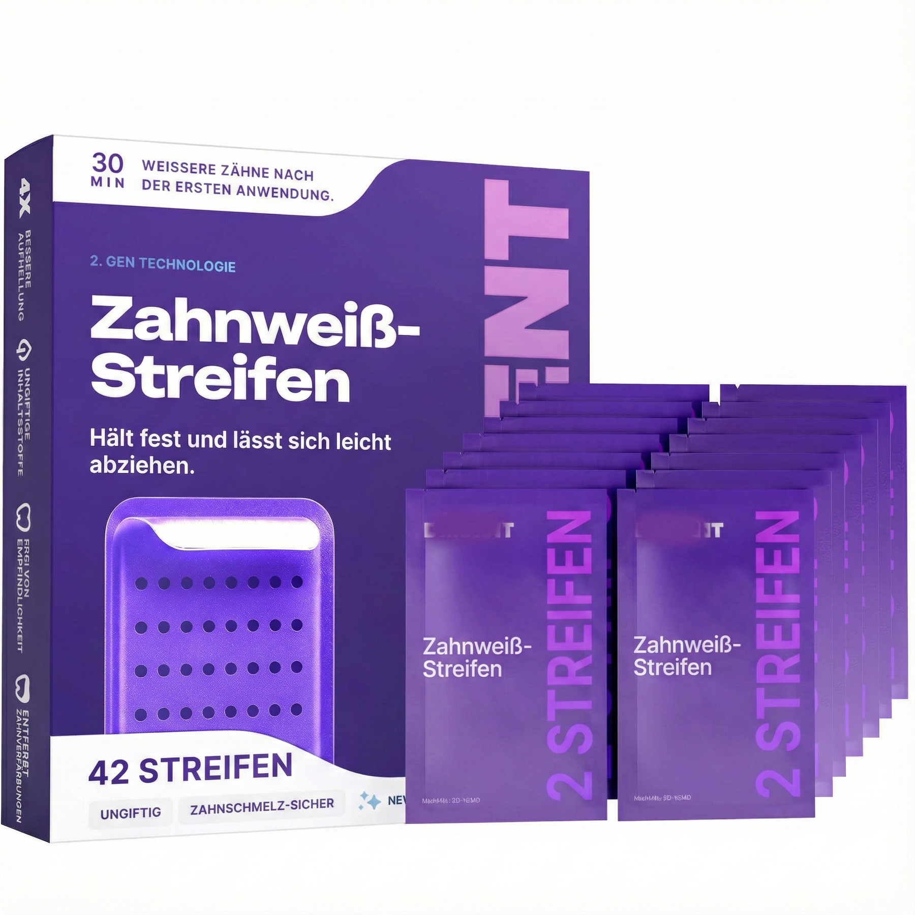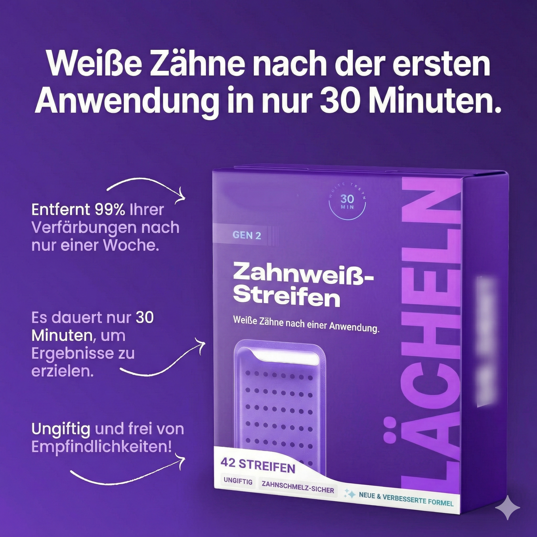 - Sichtbar weißere Zähne nach 30 Min.